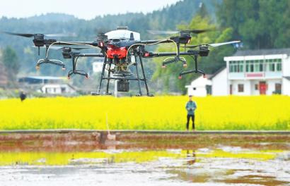 近日,在南充市蓬安县河舒镇柳滩社区,农技人员正在操作植保无人机播撒谷种。 刘永红 摄(C视觉)