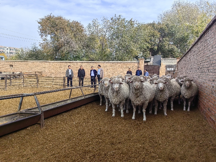 兵团农业农村局畜牧兽医处、兵团畜牧兽医工作总站专家组在新疆农垦科学院种羊场对肉用美利奴进行品种改良选育。(兵团农业农村局 淮河摄)