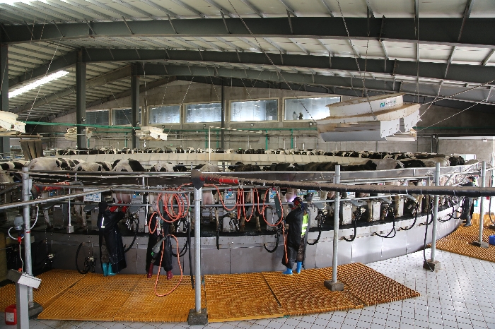 员工在天润北亭万头规模化奶牛示范牧场挤奶厅挤奶。示范牧场项目采用国际先进的全自动挤奶设备、多功能奶牛牛舍、全天候奶牛饲喂配料系统以及完善的粪污处理环保系统,硬件配置达到国际领先水平。(兵团农业农村局淮河摄)